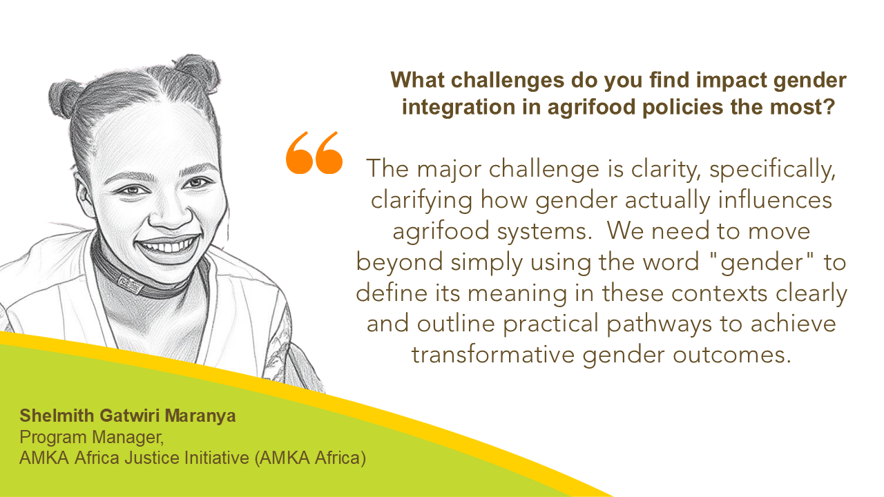Shelmith: I find that the major challenge is clarity, specifically, clarifying how gender actually influences agrifood systems. We need to move beyond simply using the word “gender” to define its meaning in these contexts clearly and outline practical pathways to achieve transformative gender outcomes.