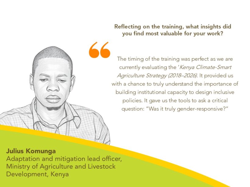 Julius: This was a space for learning and sharing across diverse perspectives, from academia, research, and other government departments. The timing was perfect, especially as my department is currently evaluating the ‘Kenya Climate-Smart Agriculture Strategy (2018–2026)’. The training emphasized the importance of gender analysis and building institutional capacity to design inclusive policies. This training equipped us with the tools to ask a critical question: “Was it truly gender-responsive?” More importantly, it gives us the know-how to ensure the following strategy is.